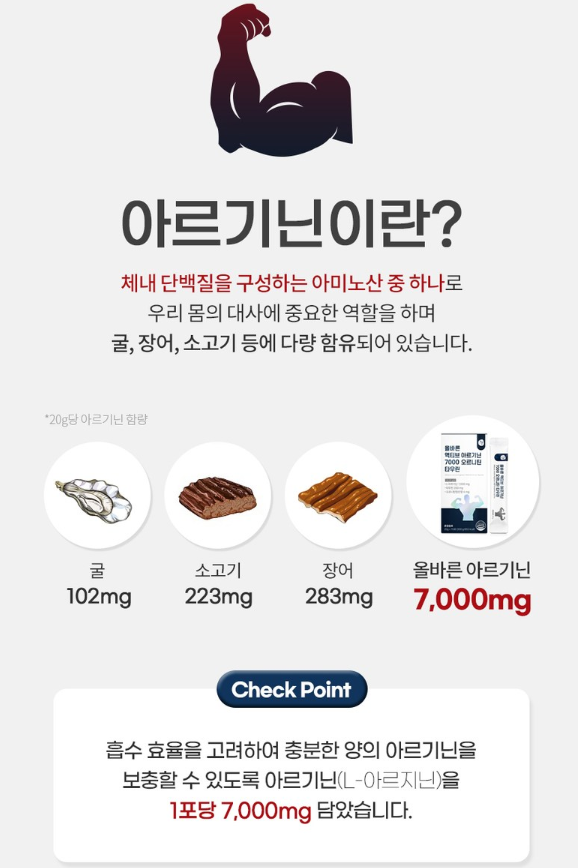 올바른 액티브 아르기닌 7000에는 고함량의 아르기닌이 포함되어 있어, 이러한 효과를 더욱 효과적으로 경험할 수 있습니다.