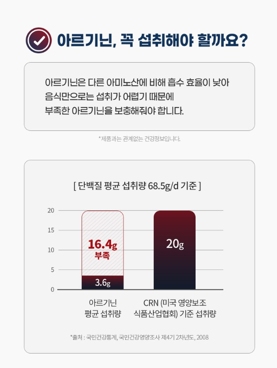 또한 아르기닌은 혈관 확장에 도움을 주어 혈액 순환을 개선하고, 심혈관 건강에도 긍정적인 영향을 미칩니다. 이러한 효과로 인해 피로 회복과 전반적인 신체 기능 향상에 도움을 줄 수 있습니다.
