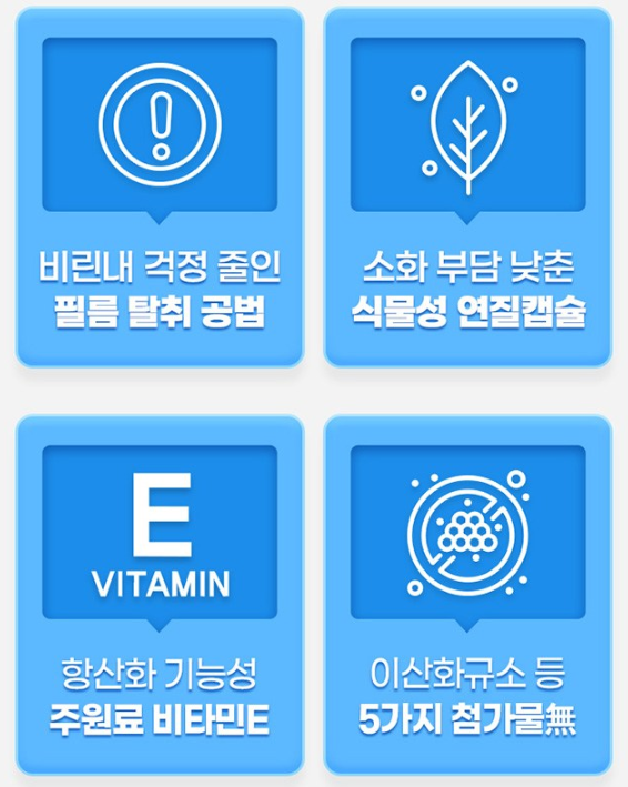 주요 특징으로는 2캡슐 기준 EPA+DHA 함량이 1,000mg에 달하는 고함량 제품이라는 점입니다. 또한 식물성 캡슐을 사용하여 소화 흡수가 용이하고, 비타민 E가 함께 포함되어 있어 항산화 효과도 기대할 수 있습니다.