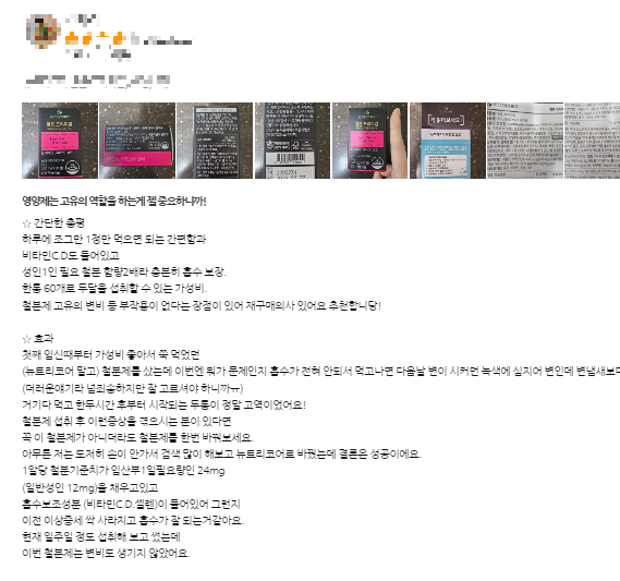 "평소 빈혈 증상이 있어서 철분제를 찾다가 이 제품을 알게 됐어요. 한 달 정도 복용했더니 피로감이 확실히 줄어든 것 같아요."