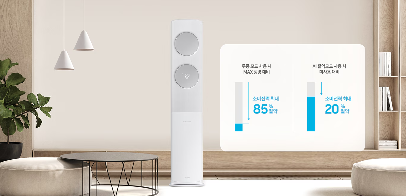 무풍 모드를 사용할 경우 소비전력이 MAX 냉방 대비 최대 85 %까지 절약되고