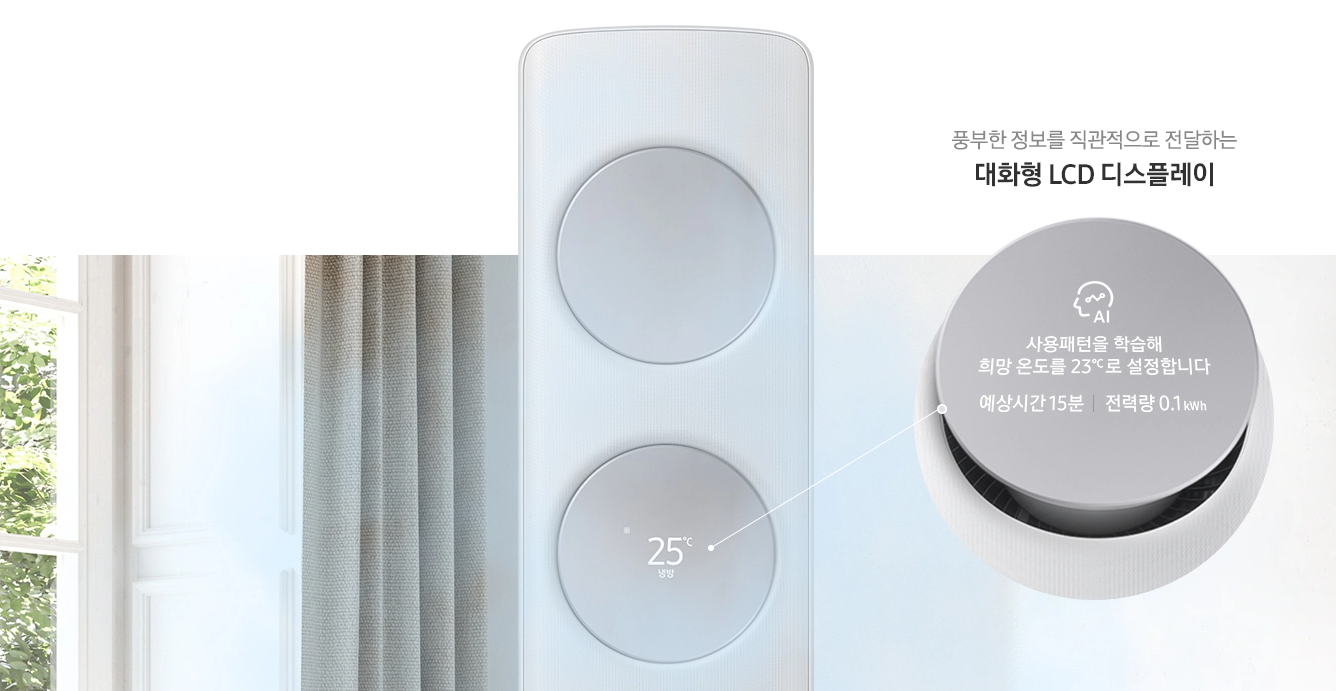 무풍에어컨은 넓은 무풍패널의 마이크로홀에서 냉기를 뿜어주어 마치 동굴에 들어온 것처럼 기분 좋은 쾌적함을 오랫동안 유지해드립니다. 하단 바람문 아트패널에 대화형 LCD 디스플레이를 적용해 기존의 LED 디스플레이에 비해 더 많은 정보를 친절하고 직관적으로 전달합니다.
