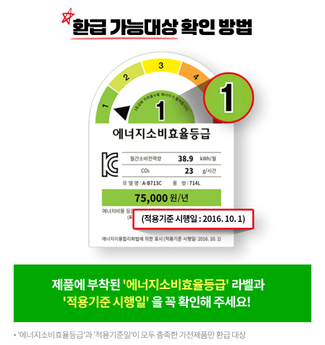 | TV·냉장고·세탁기·에어컨 등 | 효율 최고등급 모델 | 라벨·모델명 일치 여부 | 구매가의 10% |