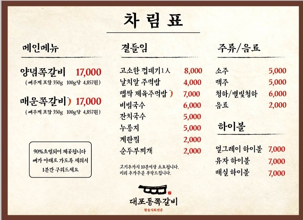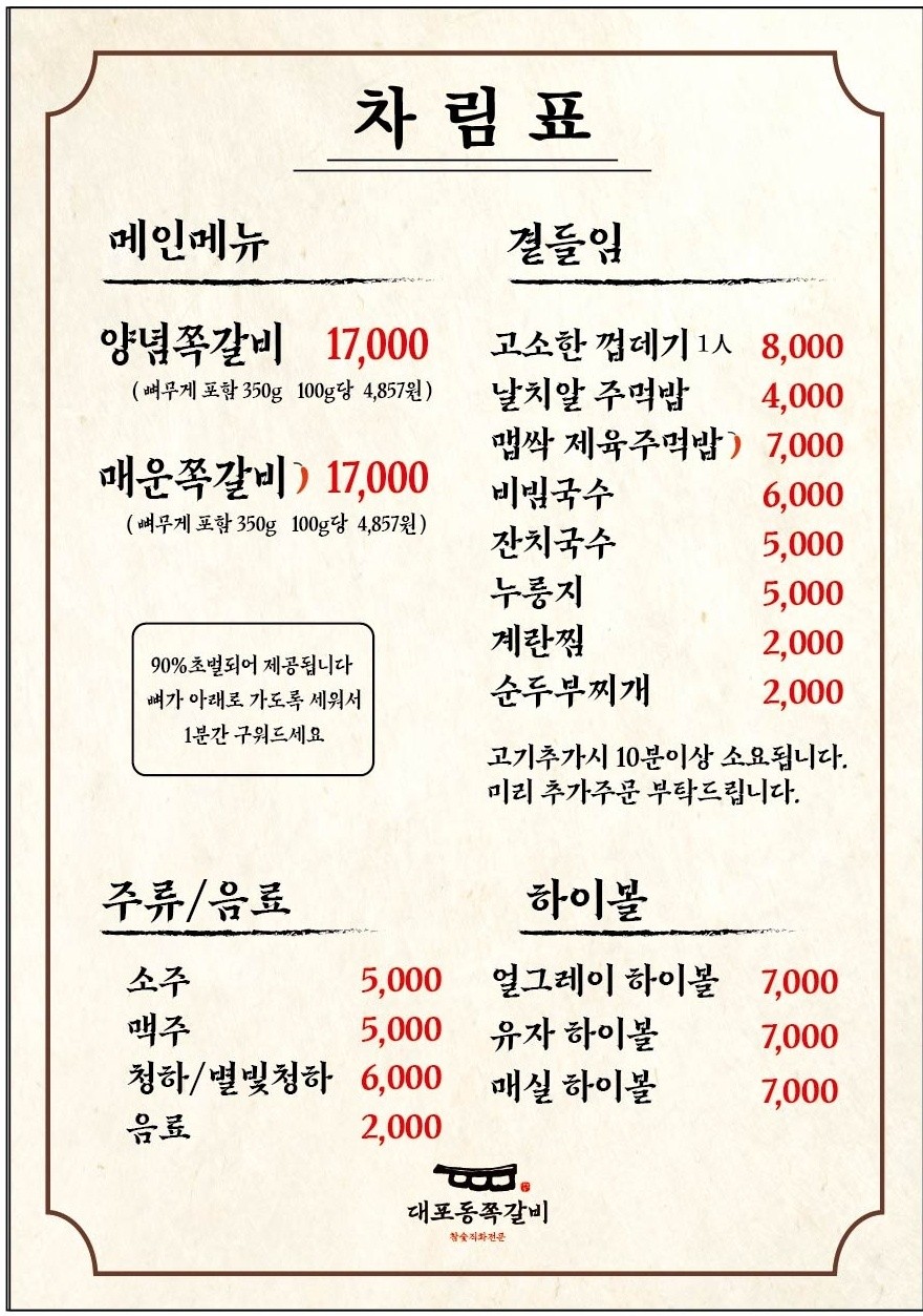 대표 메뉴는 양념쪽갈비, 매운쪽갈비 2가지로 반반으로도 주문 가능합니다.